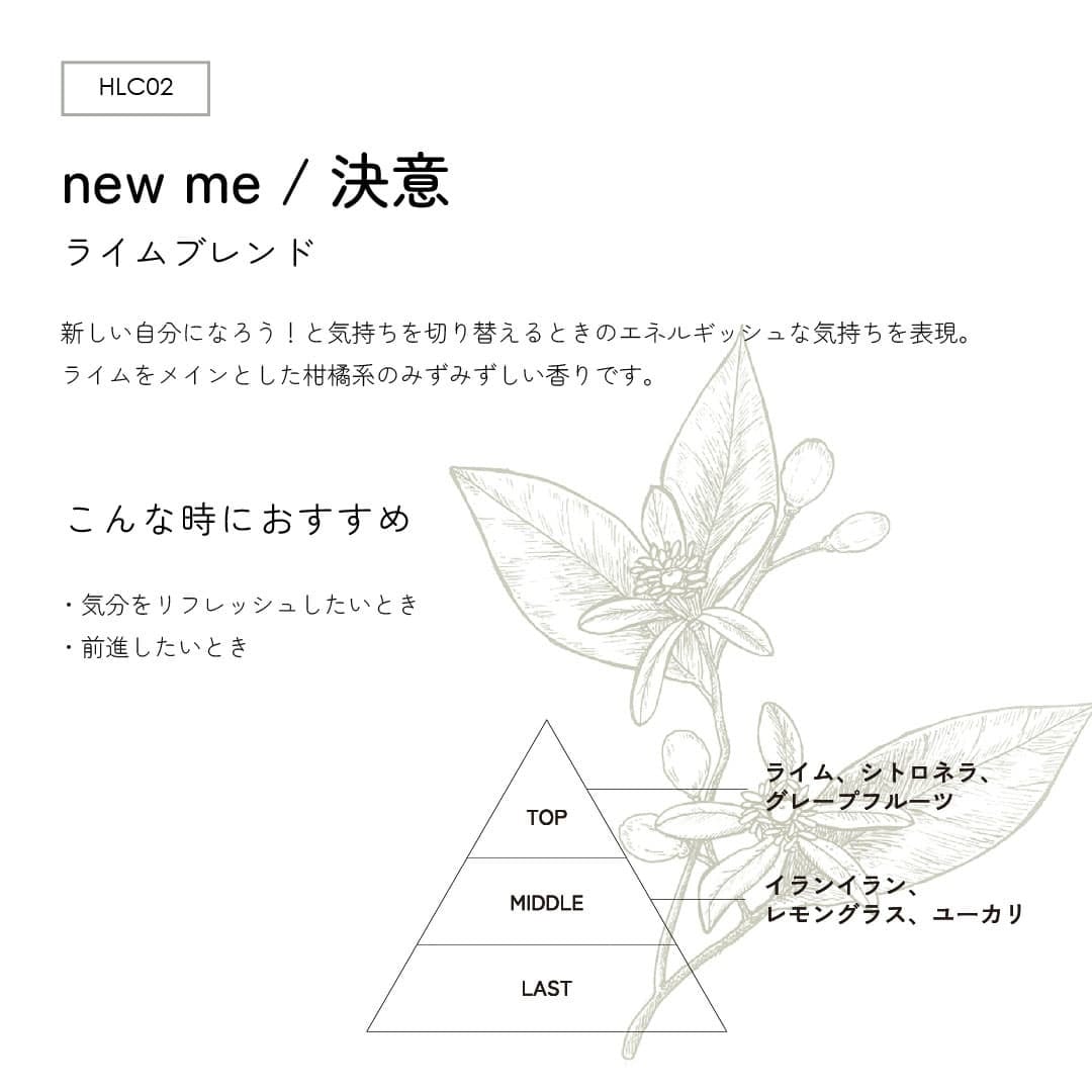 「new me/決意」は、新しい自分になろう!と気持ちを切り替えるときのエネルギッシュな気持ちを表現。ライムをメインとした柑橘系のみずみずしい香りです。